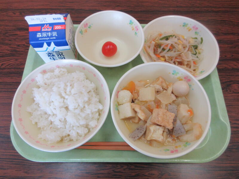 本日の献立は、麦ごはん、牛乳、みそおでん、マロニーの和え物、ミニトマト です。