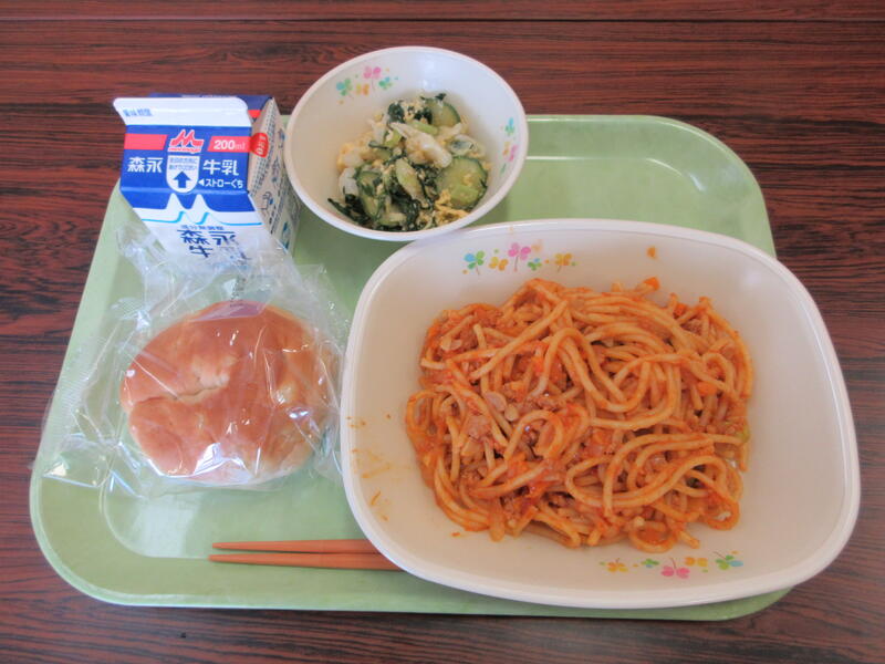 今日の献立は、パインパン、牛乳、スパゲッティミートソース、小松菜と卵のサラダ です。