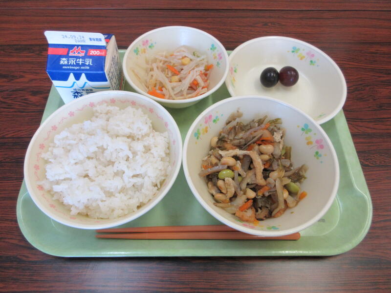 本日の献立は、 麦ごはん、牛乳、大豆の磯煮、マロニーの和え物、ぶどう です。