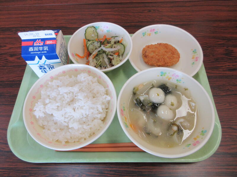 今日の献立は、麦ごはん、牛乳、白玉汁、にくじゃがコロッケ、ゆかい和え です。