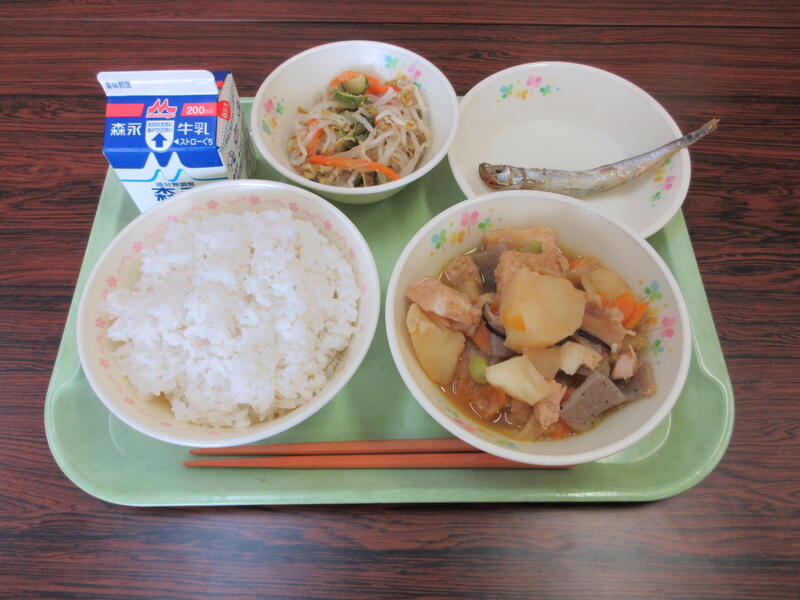 本日の献立は、麦ごはん、牛乳、けんちん汁、魚とポテトのナッツあえ、にらともやしのごま和え です。