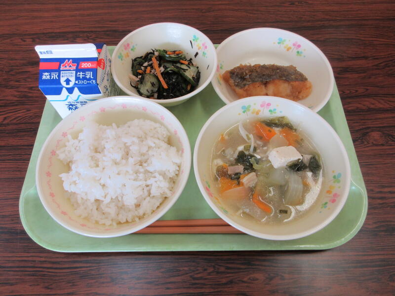 本日の献立は、麦ごはん、牛乳、冬瓜スープ、魚の香味ソース、ひじきのサラダ です。