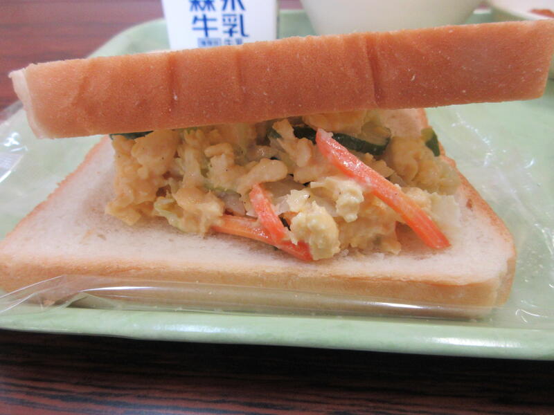 本日の献立は、食パン(セルフたまごサンド)、牛乳、クリームスープ、子持ちししゃもフライ、エッグサラダ です。