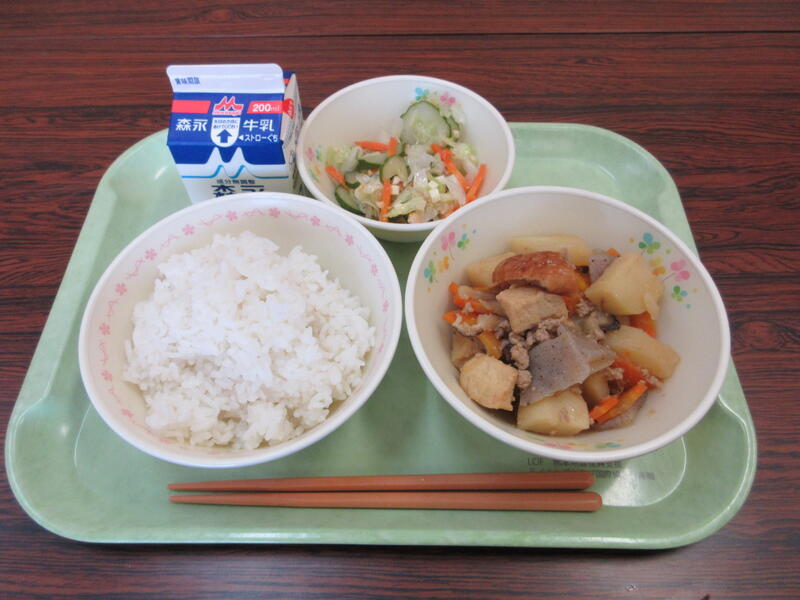 本日の献立は、麦ごはん、牛乳、じゃがいものそぼろ煮、大根サラダ、みかんです。
