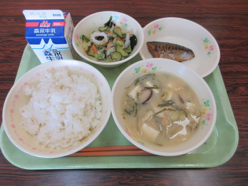 本日の献立は、麦ごはん、牛乳、呉汁、さばのソース煮、ちくわとわかめの酢の物 です。