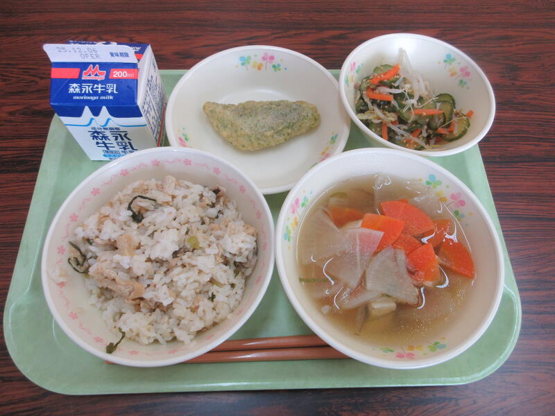今日の献立は、こぎつねごはん、牛乳、いちょう葉汁、たらの磯辺揚げ、ごま酢和え です。