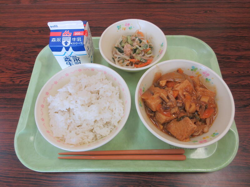 本日の献立は、麦ごはん、牛乳、家常豆腐、野菜のごまサラダ です。
