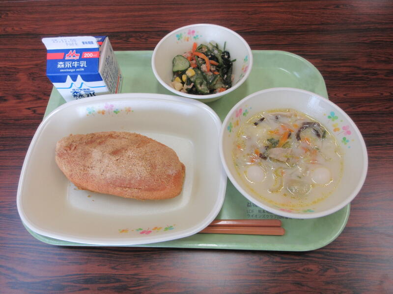 クリームスパゲティにも牛乳が使われています。給食では毎日200mlの牛乳を飲むことができます。成長期にある子ども達には「カルシウム」を摂取できるので大切です。今日はダブルで摂取しましょう。