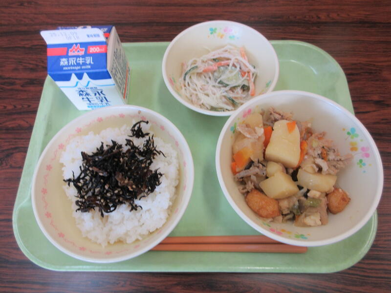本日の献立は、麦ごはん、牛乳、肉じゃが、春雨のアヨネーズ和え、ひじきときくらげのふりかけ です。