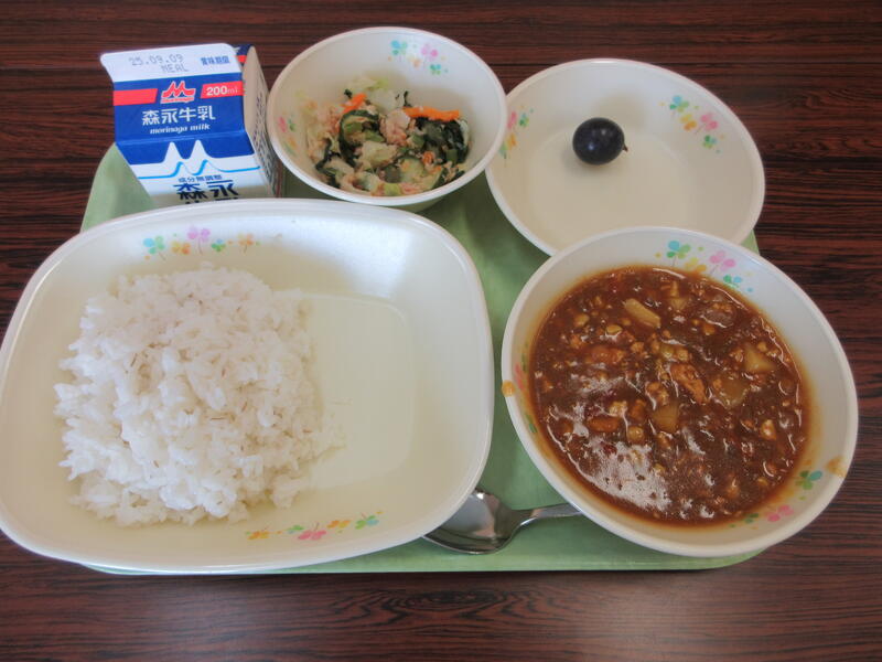 今日の献立は、チキンカレーライス、牛乳、ツナつなサラダ、ぶどう です。