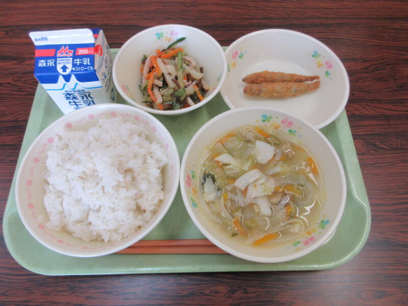 本日の献立は、麦ごはん、牛乳、汁ビーフン、きびなごフライ、千切りじゃがいものサラダ です。