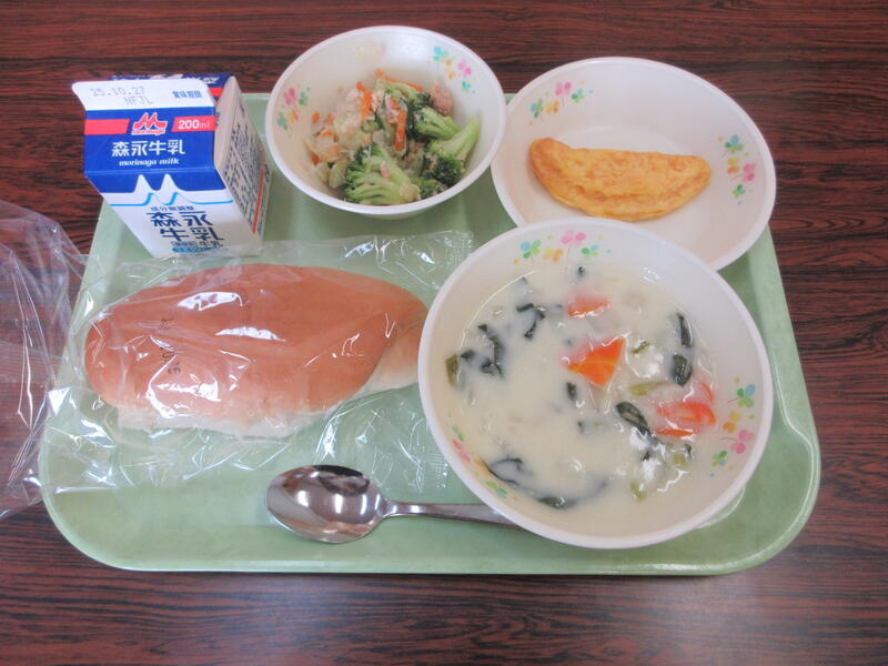 本日の献立は、コッペパン、牛乳、小松菜のクリームスープ、オムレツ、ブロッコリーサラダ です。