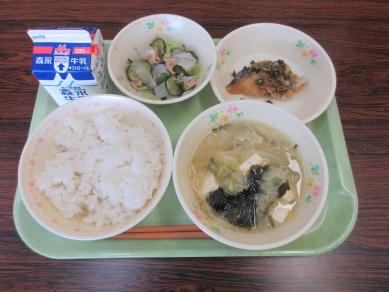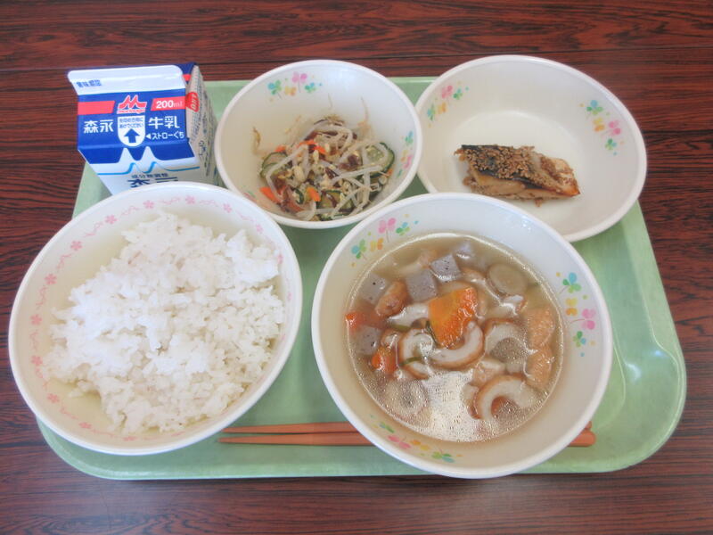 今日の献立は、麦ごはん、牛乳、つぼん汁、さばのごま焼き、きくらげともやしの酢の物 です。