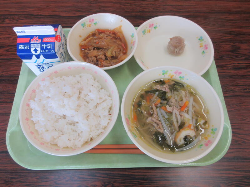 本日の献立は、麦ごはん、牛乳、汁ビーフン、焼肉風炒め、焼売(シューマイ) です。