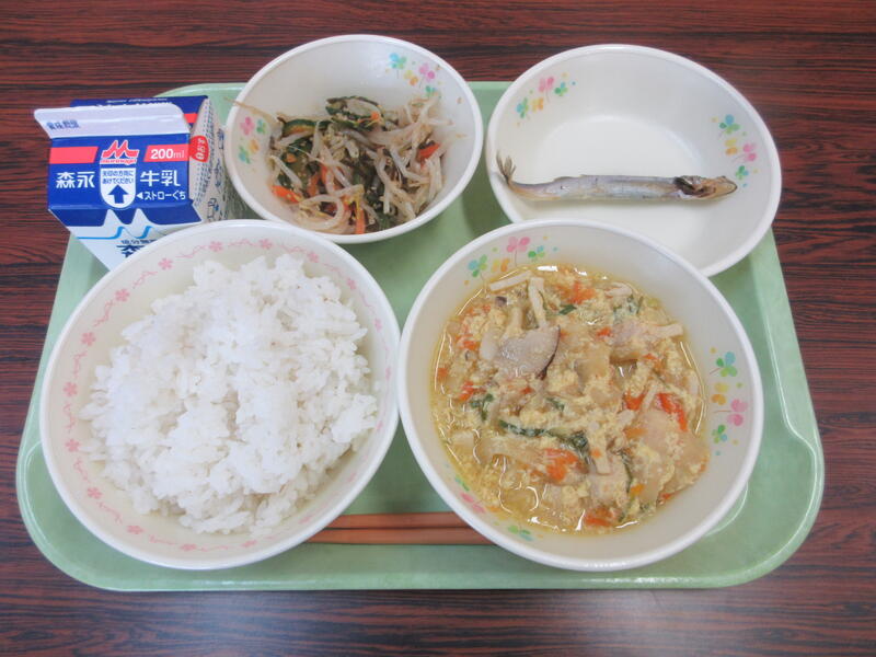 本日の献立は、麦ごはん、牛乳、親子煮、焼きししゃも、もやしの昆布和え です。