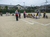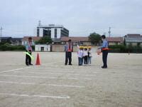 まず3年生が実際に自転車の安全な乗り方について学びました。1・2年生は正しい道路の歩き方を教えていただきました。今年は県道高森線4車線化に伴い、「18m横断歩道」をつくり安全な渡り方を体験しました。4~6年生は、体育館で「青切符」に関連する自転車ルールをDVDで学数しました。