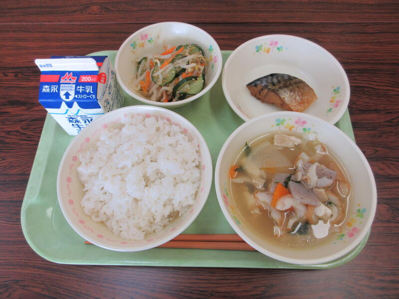 今日の献立は、麦ごはん、牛乳、具だくさん汁、さばのソース煮、ピリ辛きゅうり です。