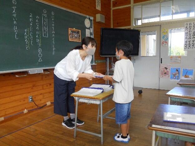 7月20日(火)、1学期の終業式を迎えました。終業式では、まず校長先生から1学期の振り返りや夏休みにがんばってほしいことについてお話がありました。次に、各学年の代表が1学期にがんばったことを発表しました。最後に、夏休みのくらしについて担当の先生や保健委員会からの話がありました。その後、各学級で夏休みのくらし等についての話があり、担任の先生から通知表が渡されました。1年生教室では、初めてもらう通知表を真剣な表情で読んでいる子どもたちの姿が印象的でした。