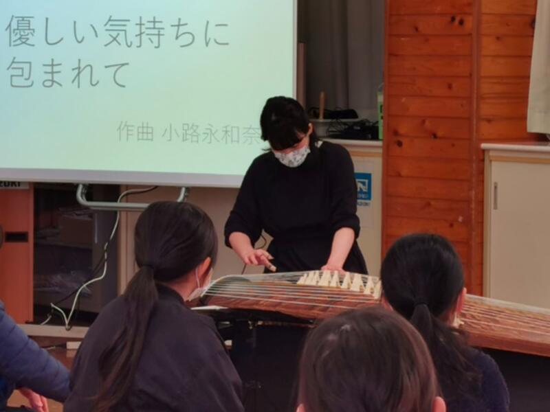 演奏中、子どもたちは箏に目が釘付けで、中には体をゆらして楽しんでいる場面も見られました。箏のきれいな音色に子どもたちは優しい気持ちに包まれました。