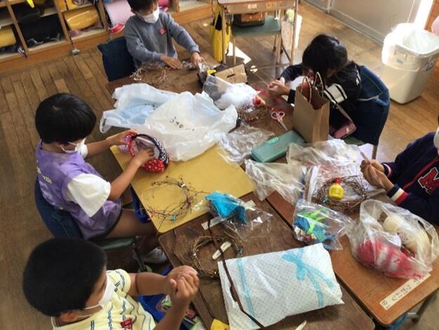 1年生は生活科の学習で、朝顔の種を植え、観察をして、夏休み中もずっとお世話を頑張ってきました。今回は、その朝顔のつるを使って「リースづくり」に取り組みました。子どもたちはお家で準備した飾りをつけて、素敵なリースを作ることができました。
