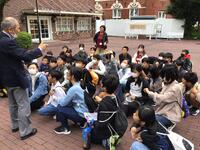 平和の泉で、石碑の説明を聞いています。みんな真剣です。