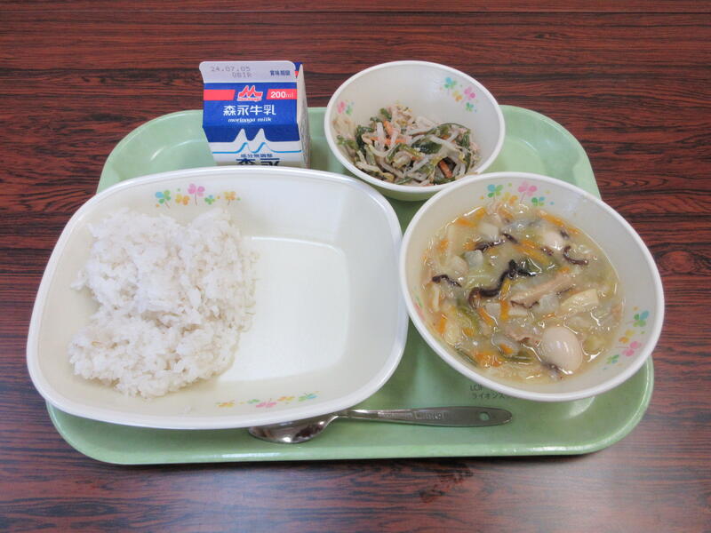 今日の献立は、麦ごはん、牛乳、トックのスープ、麻婆茄子、ミニトマト です。