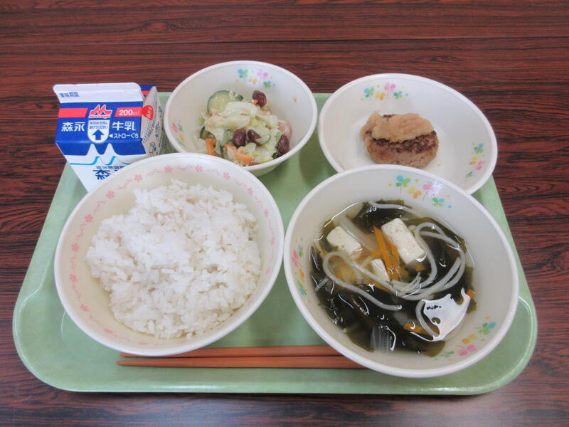 今日の献立は、麦ごはん、牛乳、魚そうめん汁、ハンバーグのおろしソース、豆とナッツのサラダ です。