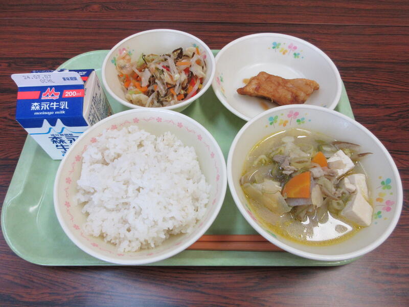 本日の献立は、麦ごはん、牛乳、豚汁、ホキのかば焼きソースがけ、ピーマンの昆布あえ です。