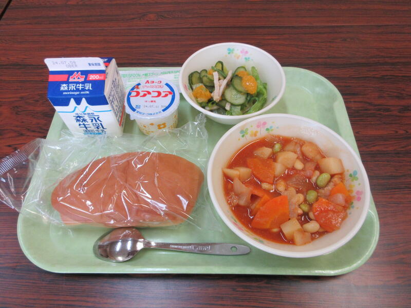 クリームスパゲティにも牛乳が使われています。給食では毎日200mlの牛乳を飲むことができます。成長期にある子ども達には「カルシウム」を摂取できるので大切です。今日はダブルで摂取しましょう。