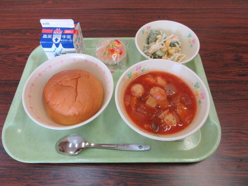 いつものパンは菊池の県パン工場でつくられているのですが、本日のコッペパンは益城町給食センターで焼かれたものですので、焼き立ての香ばしいにおいも格別です。トマト煮によく合いました。