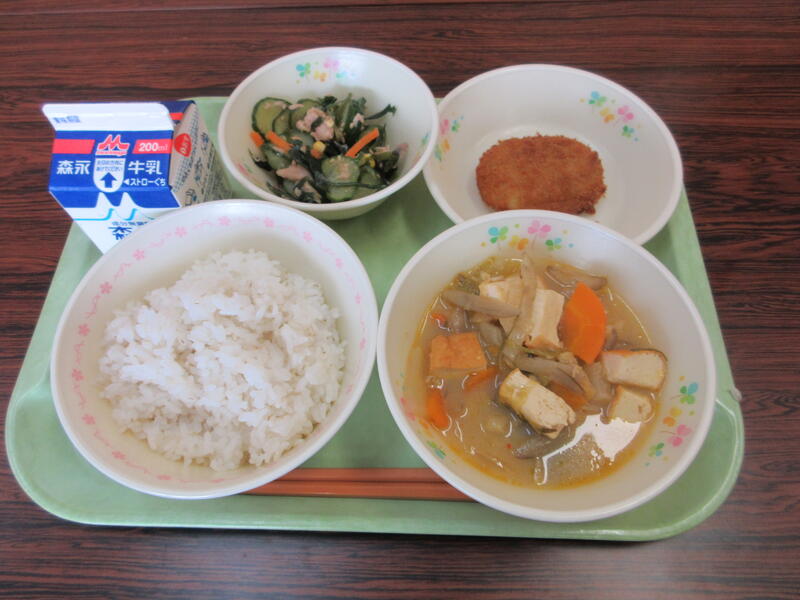 本日の献立は、麦ごはん、手作りふりかけ、牛乳、カレー肉じゃが、マロニーの酢の物 です。