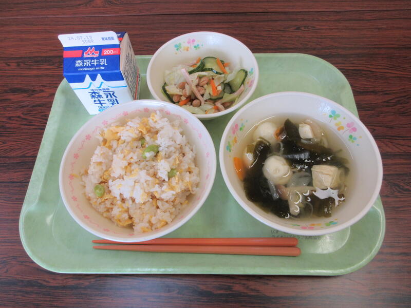本日の献立は、鶏そぼろごはん、牛乳、はんぺんのすまし汁、いり大豆のサラダ です。