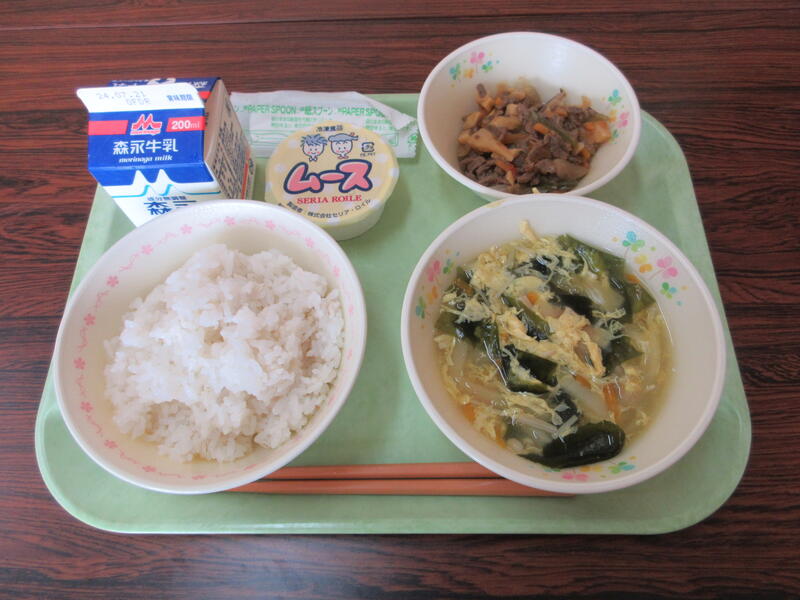 本日の献立は、麦ごはん、牛乳、卵とわかめのスープ、チンジャオロウスウ、ムース です。