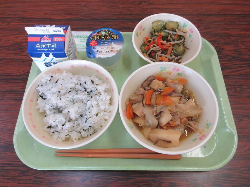 今日の献立は、わかめごはん、牛乳、里芋の旨煮(うまに)、ピーマンの昆布和え、ヨーグルト です。