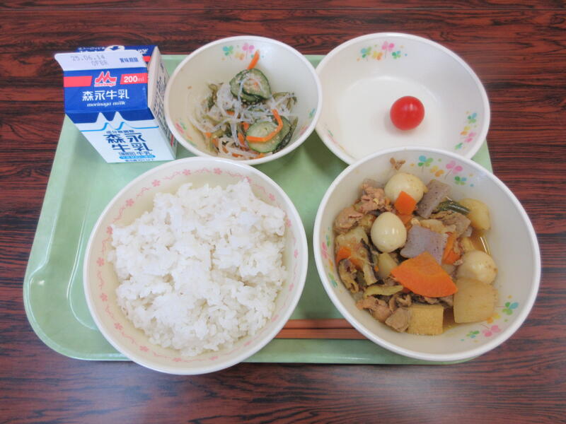 本日の献立は、麦ごはん、牛乳、カレー肉じゃが、春雨のごま酢和え、ミニトマト です。