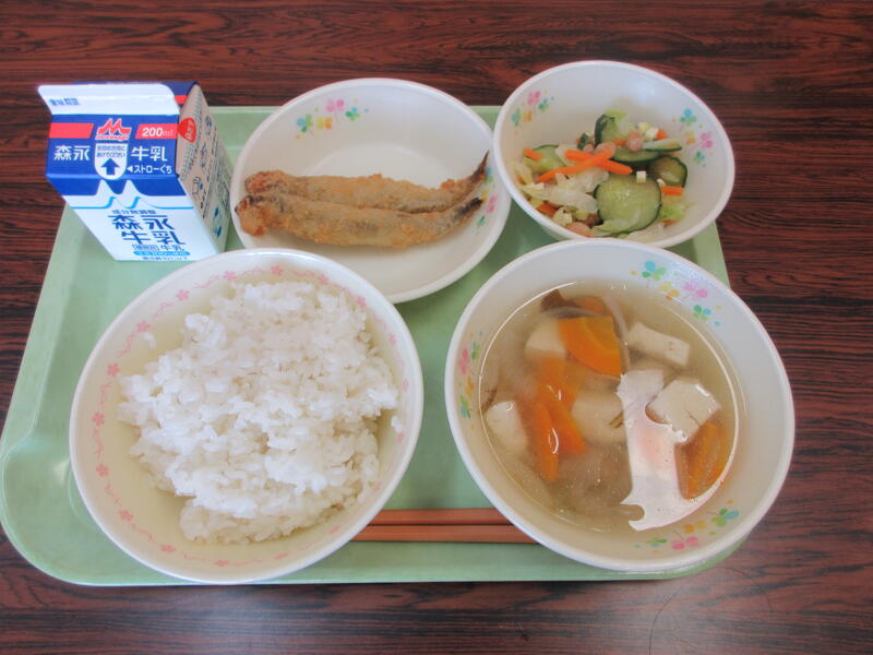今日の献立は、麦ごはん、牛乳、とりだんご汁、ししゃもフライ、かみかみチーズサラダ です。