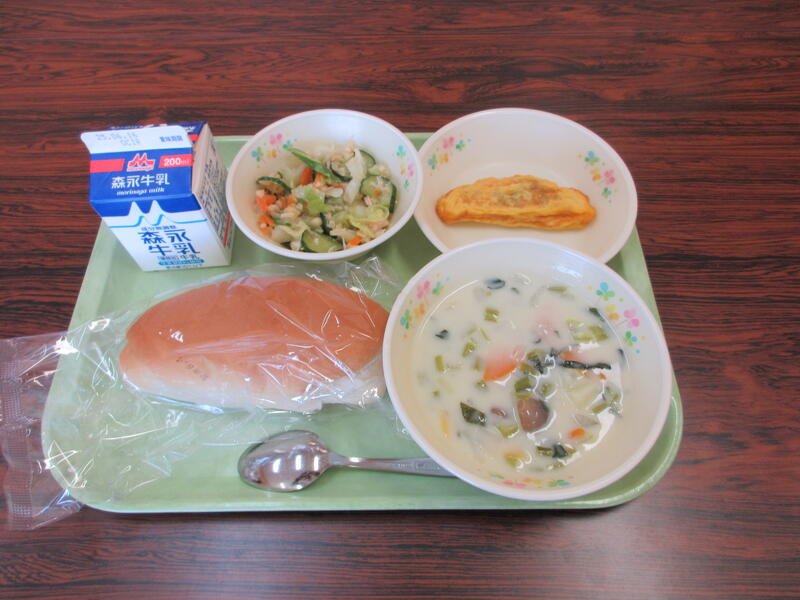 本日の献立は、コッペパン、牛乳、小松菜のクリームスープ、オムレツ、アスパラサラダ です。