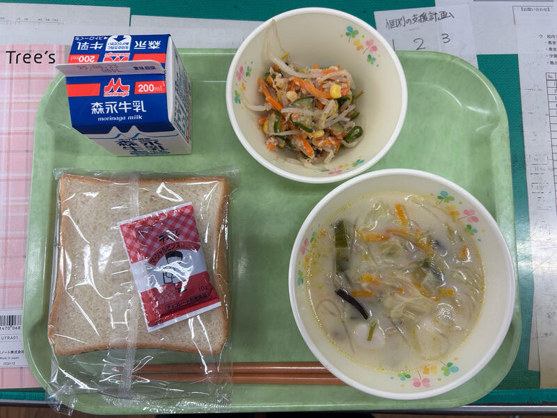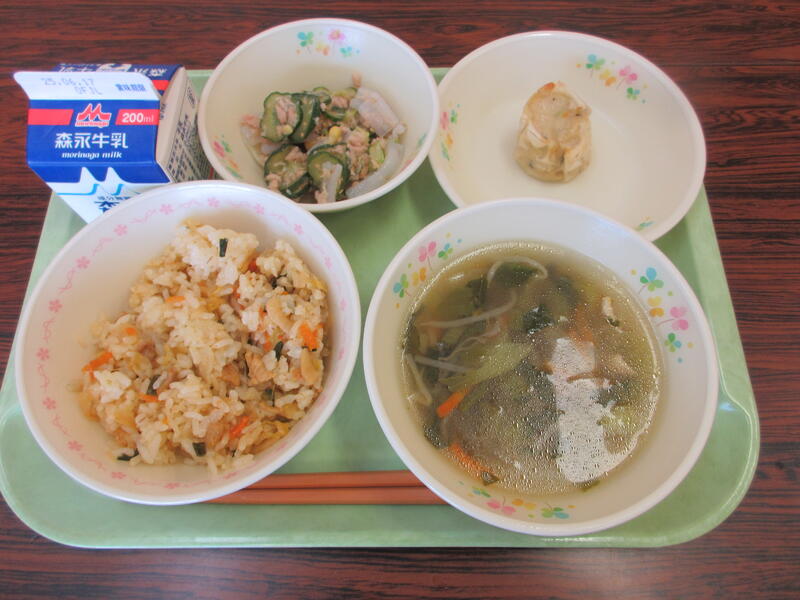 今日の献立は、キムチごはん、牛乳、チンゲンサイの中華スープ、とうふシュウマイ、こんにゃくサラダ です。