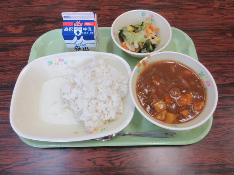 本日の献立は、チキンカレーライス、牛乳、わかめとコーンのサラダ です。
