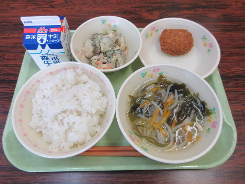 今日の献立は、麦ごはん、牛乳、うおそうめん汁、コロッケ、野菜のうめマヨ和え です。