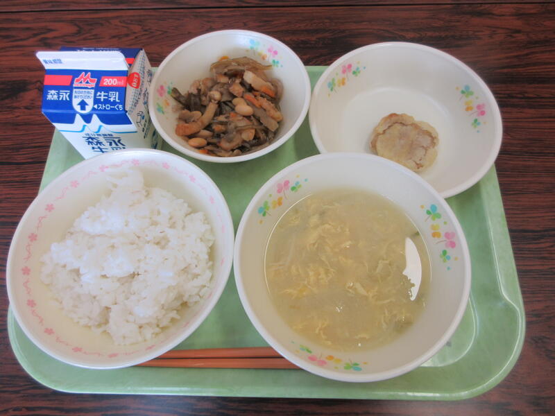 本日の献立は、麦ごはん、牛乳、かきたまみそ汁、大豆の磯煮、あじナゲット です。