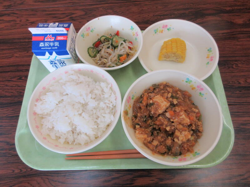 今日の献立は、麦ごはん、牛乳、ダブルマーボー、もやしとピーマンのじゃこ和え、とうもろこし です。