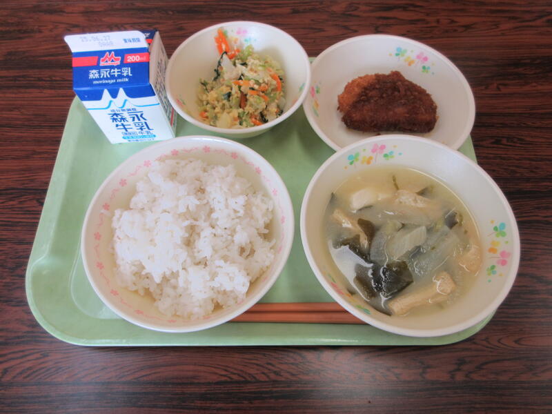本日の献立は、麦ごはん、牛乳、たまねぎのみそ汁、ソースカツ、小松菜と卵のサラダ です。