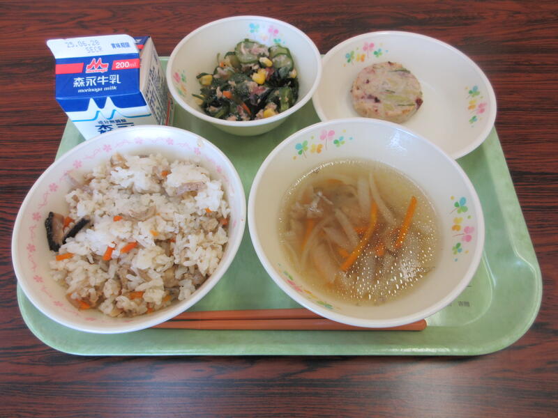 今日の献立は、かやくごはん、牛乳、沢煮椀、いかねぎ焼き、海藻サラダ です。