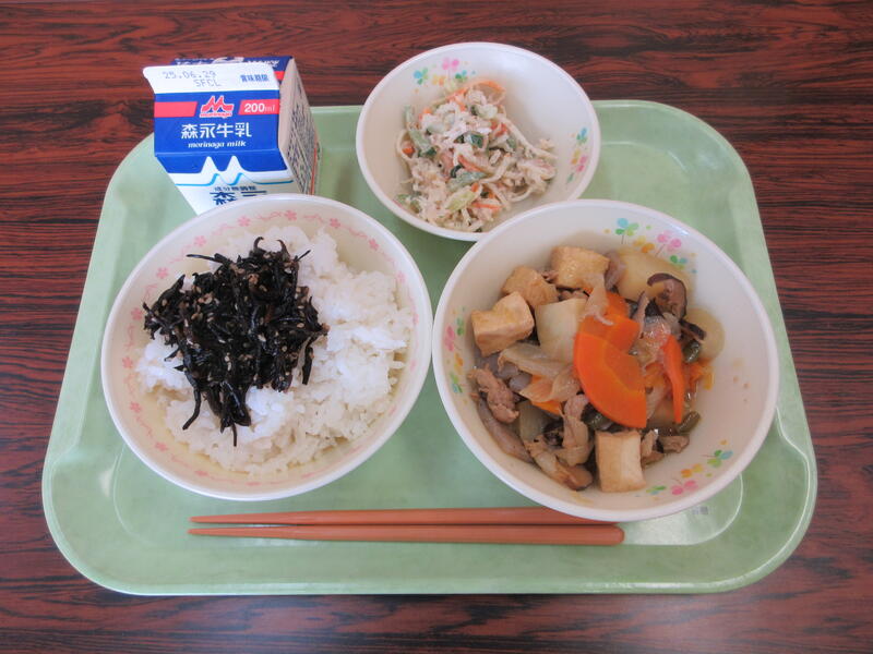 本日の献立は、麦ごはん、牛乳、厚揚げのうま煮、切り干し大根のごまサラダ、ひじきといくらげのふりかけ です。