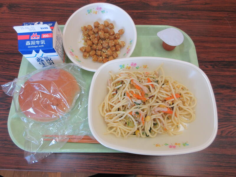今日の献立は、米粉パン、牛乳、冷やし中華、カレーガーリック豆、熊本県産トマトゼリー です。