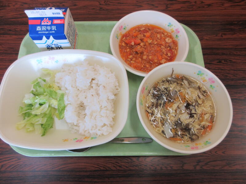 本日の献立は、タコライス、牛乳、もずくスープ です。