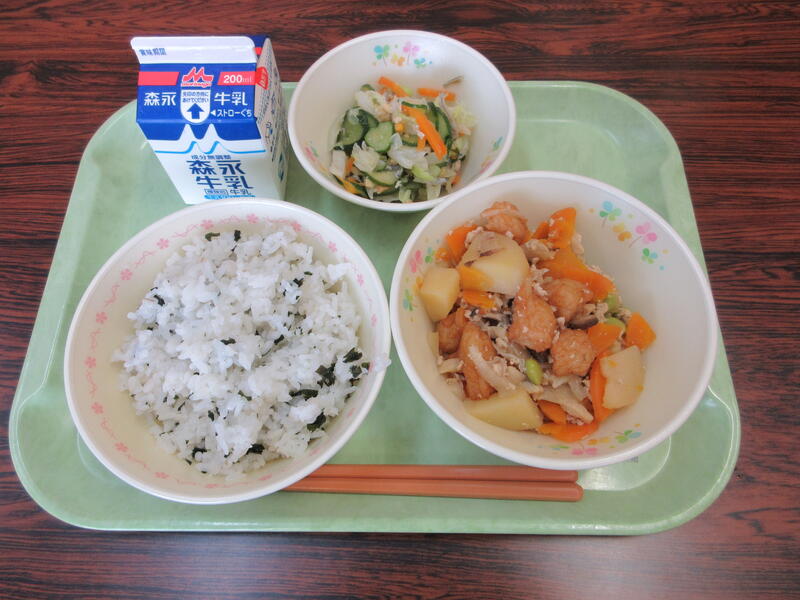 今日の献立は、わかめごはん、牛乳、じゃがいものそぼろ煮、じゃこナッツサラダ です。