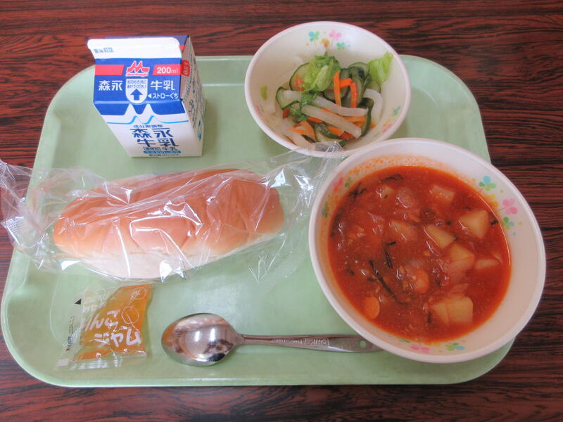 本日の献立は、コッペパン、牛乳、ポークビーンズ、グリーンリーフのサラダ、りんごジャム です。