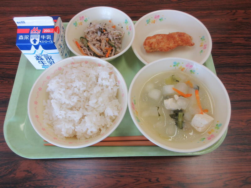 今日の献立は、麦ごはん、牛乳、冬瓜スープ、油淋鶏(ユーリンチー)、切り干し大根のゆかり和え です。